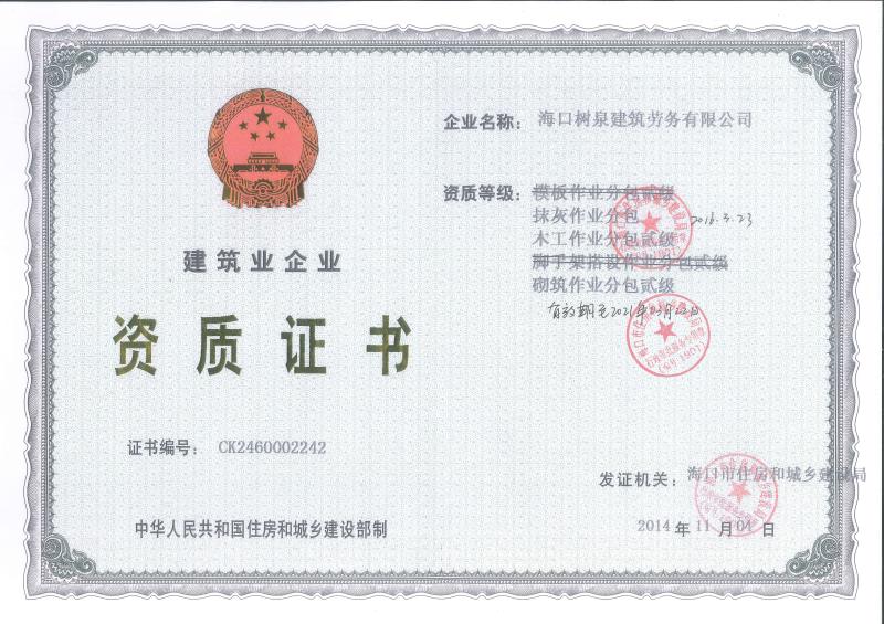 ??跇淙ㄖ趧沼邢薰境闪⒂?011年,公司位于海口,其前身是一家專業建筑施工隊,自2004年即開始在海南從事建筑勞務施工。自成立至今,公司已經擁有一支科學管理、質量過硬、能打硬仗,搶工期的專業隊伍。能獨立承擔大中型工業與民用建筑 、室內外裝修、各類機電設備安裝工程。代表工程有海口濱海華庭、三亞時代海岸T01/02/04/05棟高層、合肥東海花園二期、陵水富力灣B區高層、三亞金中海(酒店)、瓊海大印經典花園、海口環球海景大酒店(四星級酒店,在建中)、陵水珍珠大廈(五星酒店)、海口萬達廣場、美蘭機場二期。